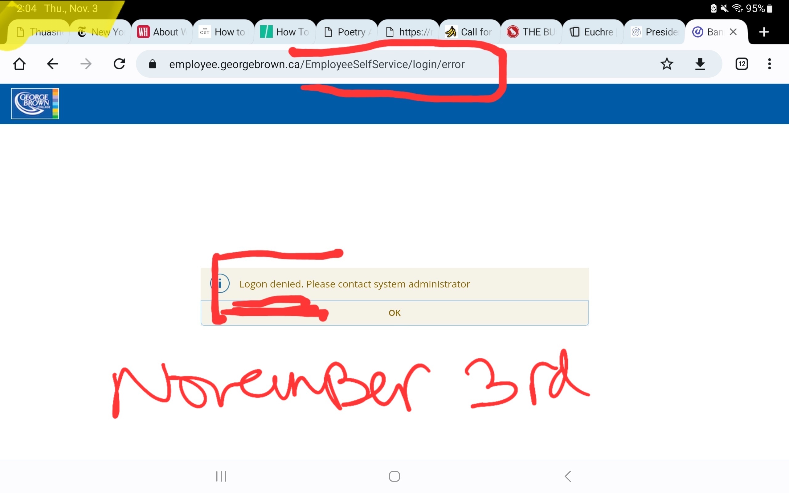 Now *suddenly* my employee access is restricted again.  Erin Campbell in human resources at George Brown College tried to say it was a password issue.  Hmm.  But my password works fine - I can access everything online EXCEPT employee specific webpages.